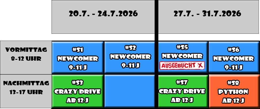 Ein Camp beinhaltet 20 Einheiten und erstreckt sich über 1 Woche von Montag bis Freitag. Alle Materialien, Hardware und Software werden für die Dauer des Kurses zur Verfügung gestellt.